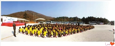 怀着无比兴奋和激动,冷峻的教官,严正的语调,最快的执行给了热切的心情淋上一桶冰,转眼的功夫,孩子们冷静的站在各方阵队列里,任何动向都需要举手报告成了现学现卖的动作要求。阳光下,两脚立正、腰板挺直、目视前方,一身迷彩示范着简单的规范,孩子们很快融入进队列,俨然一副小士兵的模样让人忍俊不禁。响亮短促的口号,划破了长空,近700人的方阵,踏响了开营仪式。各种训练也随之而来。沐浴阳光练习军姿、一排排、一列列严整有序、阵仗浩大。此时身着迷彩的孩子,英姿勃勃、威风凛凛。