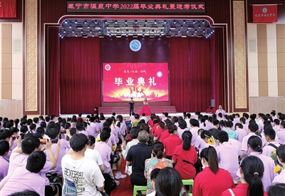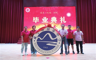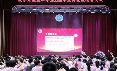 毕业典礼分为“诉说心语”“爱的寄语”“毕业壮语”三个环节。在庄严的国歌声中,毕业典礼拉开了帷幕。