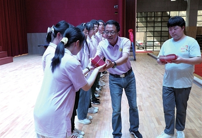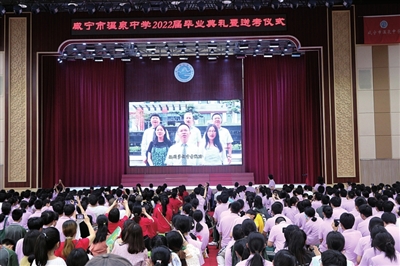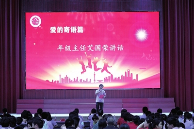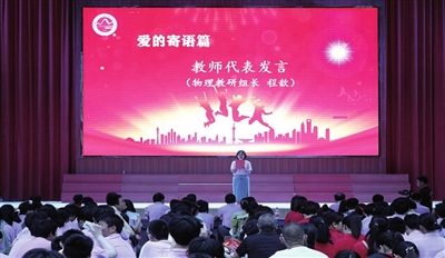 在“爱的寄语”环节,现场播放了各个备课组为同学们精心录制的祝福短视频,语文备课组为初三学子送去美好祝福:行而不辍,未来可期,且待鹏展翅,凤飞翔,笑看青云上金榜。教师代表程歆在毕业典礼上带去了对同学们的期望与祝福,期望他们用感恩代替冷漠,用坚强战胜软弱,祝福他们放飞梦想,扬帆起航。徐佳老师和学生用歌曲串烧《你的眼睛像星星》《纪念》表达师生对初三生活的纪念。年级主任艾国荣在毕业典礼上也表达了自己的心愿:他希望孩子们能在更高的学府里,在梦想的天空里,尽情翱翔。