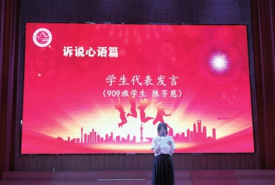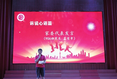 在“诉说心语”环节,学生代表2019级(9)班陈芳慈作了发言。她回顾了自己三年来学习生活片段,感受到老师的谆谆教诲,同学们的脉脉情深,在这里收获知识与友情,在离别之时,她感恩母校,感激师长,感谢同学,她决心全力以赴战中考,不负青春圆梦想。家委会代表孟有幸深情回忆了孩子们三年来的成长与进步,感恩学校的先进教育理念和老师们的精心培育与教诲。同时,他向所有的少年学子提出了自己的期望:第一是要坚持努力学习,第二是要做一个好人,做一个对家人、对社会、对国家有用的人。