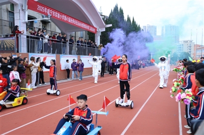 本届开幕式的一大亮点是科技元素的深度融入。科技方阵中,机器狗、机器人灵动亮相,宇航员牵引彩烟腾空而起,学生自主设计的卡丁车惊艳登场,展现了实小学子出色的创新与实践能力。更令人惊叹的是,无人机编队以“龙凤呈祥”之姿翱翔天际,七彩烟带交织出传统与现代交融的视觉盛宴,将开幕式推向高潮,也呼应了本届运动会“传承与创新”的深层内涵。
