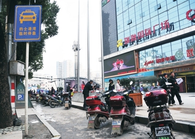 近日,记者在市区瑞融国际广场看到,位于广场前的出租车临时停靠点内停满了摩托车,的士港湾成了摩托车港湾。由于出租车无法进港停靠,给打车市民带来诸多不便。 (毛亚轩/摄)