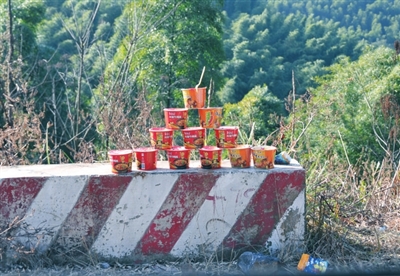 3日,记者在星星竹海风景区看到,路边的防护石墩上堆放着方便面“金字塔”。