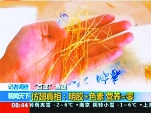 鱼翅是以鲨鱼鳍制成,在许多高档的餐厅里,鱼翅动辄要到几百元甚至上千元一份。然而,有业内人士说,在国内市场消费的鱼翅当中,大约四成是靠这种所谓的人造鱼翅来支撑的。这些鱼翅从合成,到鱼翅精调制,到烧碱明胶双氧水泡制,含有大量损伤人肾脏消化系统和致癌的物质。