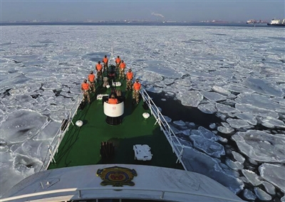 受持续低温的影响,渤海湾河北海域出现浮冰,并有进一步加重趋势。图为近日河北海警官兵在秦皇岛海域巡查冰情。