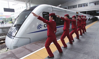蛇年春运即将开启。图为海西动姐摆出“动车style”,迎接蛇年春运。