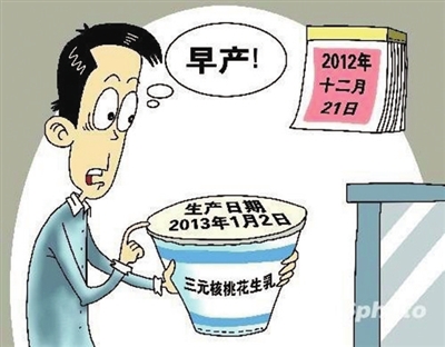 我们的日历还停留在2012年的最后几天,无良商家却早已穿越到2013年。在产品销售初期,“早产”十几天看似影响不大,但等到保质期临近的时候,消费者吃进肚子里的就已经是过期产品了,由此导致的食品安全隐患自不必说。