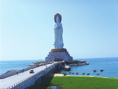 一路梵音渺渺,经幡飘舞,经轮缓转,令人隐逸渐生。南山海上观音以举世无双的高度,肩绕瑞云,脚踏宝座,衣袂飘飘,慈眉善目,手持三样法器,昭示着智慧、慈悲、和平。独立菩萨脚下的引桥上,行人如蚁,但无喧嚣。最是那一湾海水,碧绿,透亮。清风徐来,水波不惊,宛如一块澄净的琉璃。许是菩萨的净瓶里溢出的玉液,让人燥热俱消,俗念远遁,顿悟空则轻,而轻则明。