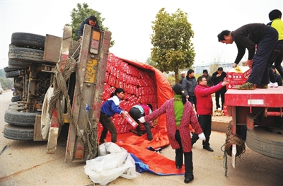 昨日中午1时许,城区横温路红牛厂区附近路段,一辆大货车在转弯时不慎发生侧翻,车上的5000余箱饮料倾翻在地。事发后,周边10余名群众迅速赶来,帮忙将车上的货物安全转移。 (赵骥)