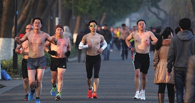 近日,一场“光猪跑”比赛在南京玄武湖畔举行,四十多位跑步爱好者光着上身跑完近10公里的路程,以此方式提倡人们亲近自然、健康生活。
