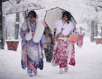 1月14日,在日本东京一家游乐场,身着和服的女孩们踏雪参加“成人节”。每年1月的第二个星期一是日本的“成人节”,刚满20周岁的日本男女穿上盛装,参加“成人式”。