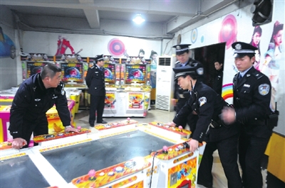 当晚8时42分,多路行动小组按照指挥部统一指挥,分头出击,一举查获城区10多个涉嫌进行游戏机赌博的场所,现场查获、销毁老虎机等一批赌博游戏机,并将涉嫌经营及参赌的违法人员带离审查。