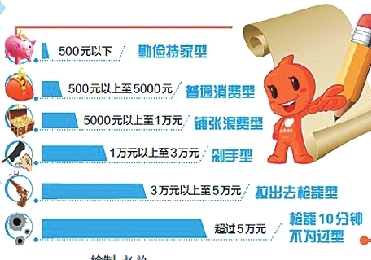“再淘宝就‘剁手’!”自从网上流行晒淘宝账单后,这样的赌咒发狠声便不绝于耳。今年,随着支付宝2012年度电子账单的推出,又有网友按照消费金额给出了新的分类标准(如左图)。