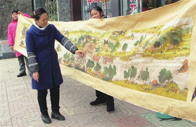 初战告捷,艾细云对大型绣品的兴趣更浓了。“从那时起,我就计划用2年时间绣一幅7米长的《清明上河图》。”艾细云说。2010年11月初,艾细云提前订购了一幅成本3000元的《清明上河图》,一心一意绣作品。