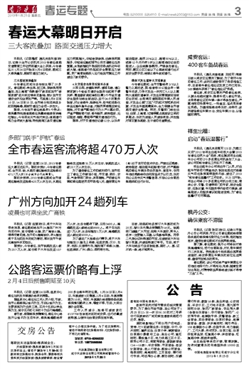 本报讯 (记者 庞赟)昨日,咸宁火车站传来消息,春运期间将加开24趟至广州方向的列车,其中普客18趟,武广高铁6趟。值得注意的是,加开的6趟高铁中,有4趟在咸宁北站的发车时间为零时,填补我市午夜无高铁车次的空白。