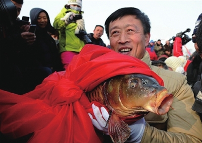 近日,沈阳卧龙湖大辽文化冬捕节在康平县卧龙湖自然保护区开幕。当天,头鱼被16.28万的天价被拍走。