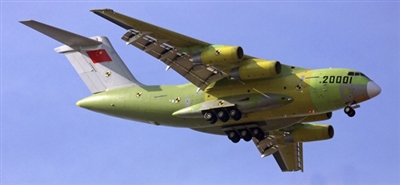 26日下午,运-20在西安阎良基地进行首飞,历时1个小时,全程由一架歼-15陪同拍摄。运-20采用四发动机和高T尾翼的设计,机长47米,翼展45米,最大起飞重量220吨。虽是以伊尔-76为设计基础,但在所有参数上均超越原型,接近美军C-17“环球霸王”水平。