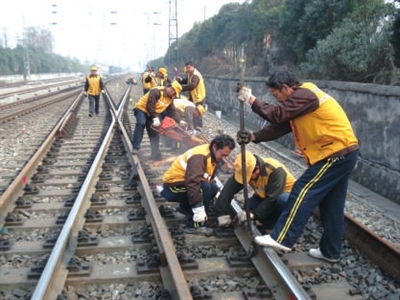 为确保春运安全,武汉桥工段咸宁线路车间加大对管内道岔设备检查整治力度,组织专业技术人员对尖轨、辙岔进行覆盖式手工检查和钢轨探伤,建立病害问题库,及时安排整治销号。图为该车间干部职工在官塘驿车站8#道岔更换直基轨、护基轨。(庞赟 叶洋)