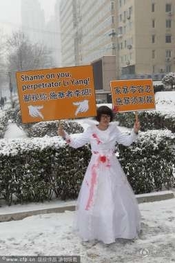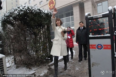 2013年2月3日,大雪纷飞,李阳外籍妻子李金与其律师来到法院。当被记者问到现在心情如何时,她只是说:“不知道,离婚不是件快乐的事。”而这也正是她今天穿白色风衣的原因。随后,李阳的代理律师也匆匆赶到现场,而作为当事人的李阳并未现身,代理律师解释称:“李阳因航班无法到场。”问及此次宣判的焦点,则仍然是财产分割和孩子抚养权问题。