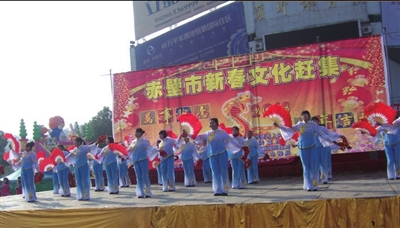 在今年的文化赶集会上,赤壁人民广场成了欢乐的海洋,数千市民们纷纷涌向这里,共享文化大餐。新春文化赶集现场,各种节目精彩纷呈,不仅有赤壁传统的舞龙灯、舞狮、采莲船,还有各乡镇的老年舞蹈队,广场上人声鼎沸,好不热闹。