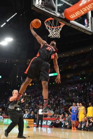 在最精彩、也是最后进行的扣篮大赛中,6位参赛选手分别拿出看家本领。经过两轮比赛,罗斯和埃文斯代表东西部进入到最后的决赛。埃文斯第一个动作跨越一块遮住的油画板后扣篮成功,然后他掀开遮布,展示了一幅自己扣篮的油画。而后向文斯·卡特致敬,穿上前辈战袍的罗斯,在完成第一个动作中,与队友完成了空中接力。第二轮埃文斯仍旧玩跨越,这次由坐在场地中央的队友将球抛起,他在跨越的同时,空中单手将球扣进。罗斯最后完成的动作是飞跃一个小孩,然后再胯下换手扣篮。通过球迷网上投票,罗斯得到了58%的支持率,获得了扣篮王称号。