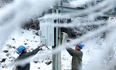 春节期间,湖北通山县九宫供电所10名员工,坚守在海拔1600米,零下5度,大雪覆盖的九宫山上,以保近千户村民用电正常。图为,2月19日(大年初十),山上又降大雪,供电员工再次进行雪后电力设备巡查。