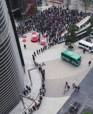近日,深圳腾讯大厦,腾讯员工在马化腾办公室外排队领红包。排队领红包的人从39楼一路排到1楼大厦外,据说有四五千人。