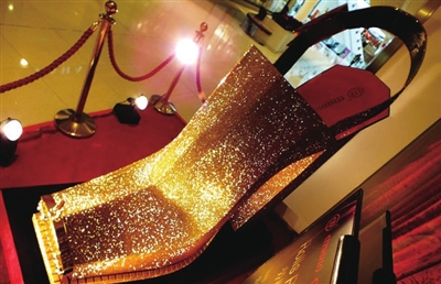 近日,广州市天河体育中心万菱汇首层,一家鞋店展出一双长高各1.8米,由31.8万粒捷克金钻作饰面的巨型鞋。