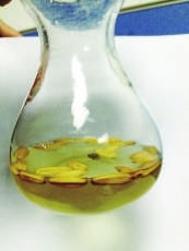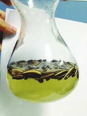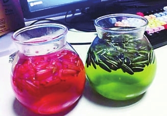 记者随后买了五香和奶油这两种销量最好的瓜子带回办公室做实验:分别把这两种口味的瓜子放在清水中,半个小时之后,原本清澈的自来水变得异常的浑浊。其中,奶油瓜子在刚刚放进水中几分钟后,清水就明显地变浑。记者凑近做实验用的实验杯的瓶口,很明显的闻到一股浓香。