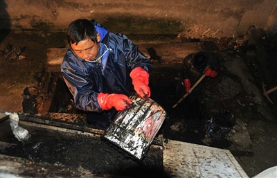 一桶、两桶、三桶……老徐接过一桶桶粪便不停地往垃圾车里倒,时不时地,他会和同事互相打趣,脏累的活儿似乎变容易了许多。