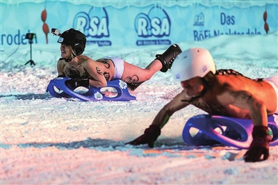 近日,德国阿尔滕贝格,2013年滑雪比赛在当天举行,参赛者上身,只身着内裤、头盔参加比赛。这一活动吸引了数千观众。
