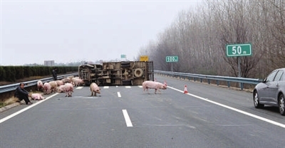 近日,一辆货车在武汉外环柏泉府桥头侧翻,车厢里的40多头生猪跑了出来,在外环线上“散步”,致使道路堵车。