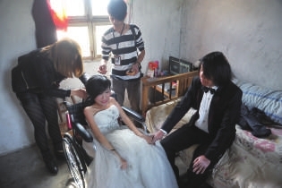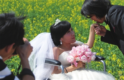 洁白婚纱,浓浓靓妆,坐在轮椅上的张细兰显得格外光彩照人。