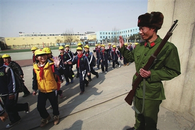 3月5日,在山东济南黄台小学,一名家长扮演成“雷锋”为学生安全保驾护航。
