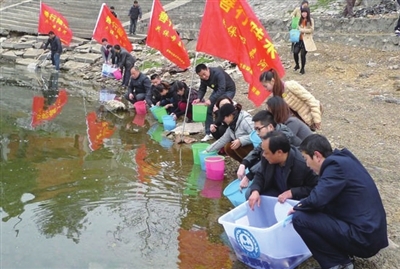 15日,赤壁市环保局青年志愿者,将自筹资金购买的1万余尾鲢鱼和鳙鱼鱼苗,小心放入陆水湖中,以实际行动唤醒市民保护“母亲湖”生态平衡的意识。 (艾菊桂葛先汉张淑娟)