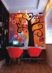 两把红色的单椅与墙面装饰相呼应,整个空间的色彩都让人觉得干劲十足。特别适合广告创意人。