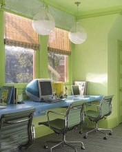 蓝色的工作台,搭配草绿色的墙面,连座椅也都是带着自然的气息,这样的工作环境会让人情绪淡定,心情平稳,最适合情绪容易波动的朋友。
