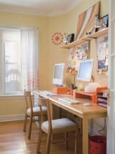 在浪漫的两人世界里也不能忘了工作。在客厅一角或卧室一角用大型书架隔出一个小小的工作室,将墙面用鲜艳的色彩进行装饰,给人无限创造的激情。