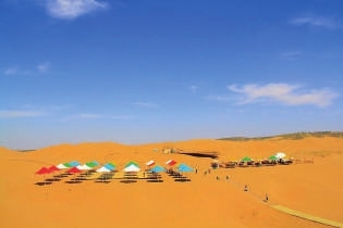 第三天,我们前往响沙湾。驱车160公里后,已经11点多,我们停下来进餐。酒店的后院已经看到很多黄沙了,我知道我们离响沙湾已经很近了。响沙湾是一片沙漠,天晴无雨、沙子干燥时,涓涓细沙从坡上缓缓流下,发出飞机轰鸣般嗡嗡声,所以得名响沙湾。响沙湾有很多刺激的项目,如滑沙、沙漠摩托、沙漠飞车等等。在蓝天白云下,在沙子的海洋里随着沙浪翻滚,和着音乐滑沙的感觉真是妙不可言。