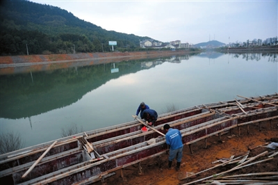 昨日,在温泉旅游新城南入口综合服务区温泉人工湖沿岸,工人正在修建木栈走廊。据悉,该木栈走廊全长3000余米,建成后将与月亮湾木栈道相连,为市民再添一休闲好去处。 赵忠志/摄