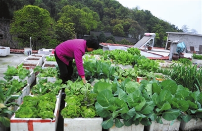 昨日记者在该楼天台上看到,近300平方米的天台被分割成多块区域,一个个装有泥土的泡沫箱里,绿油油的包菜、莴苣、芹菜、菜薹应有尽有,把楼顶装扮成了一个“空中菜园”。(图为菜园主人58岁的周女士正在天台上采摘新鲜的时令蔬菜。)