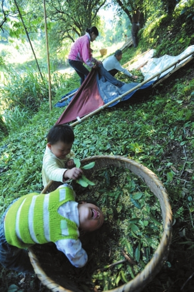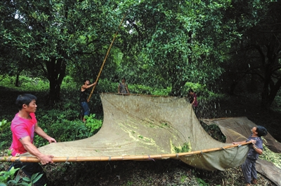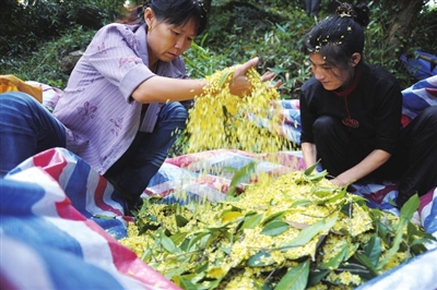 花开时节、桂树之下,牵着布棚、手执长竿,或摇曳枝头、或持竿击花,阳光下,雾雨里,花儿纷纷扬扬,飘洒在一张张洁白的布棚上,堆金叠玉、流光溢彩,好一派桂花丰收景象……