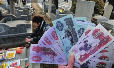 近日,京城迎来清明扫墓小高峰。部分扫墓市民在街头购买的冥币高仿人民币,亮相各大墓地、陵园。