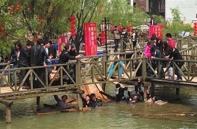 据落水游客介绍,当天他们一行33人乘坐武汉旅行社的大巴去通山旅游,中午路经刘家桥时在此吃饭。游客经过木栈桥时,木桥突然发生垮塌,桥上的7名游客掉入水中。经过短暂的惊慌,及时反应过来的游客立即把落水者拉了上来。