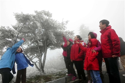 4月6日,通山县九宫山出现雾凇景观,铜鼓包一带银装素裹,美丽诱人。消息传开后,吸引了武汉、长沙、黄石等地的大批游客前来观赏。雪雁鸣/摄