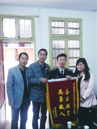 ▶近日,湖北科技学院学工处吕仲茂处长带着两位老师专程来到咸宁城管四大队,将一面写有“奋不顾身,英勇救人”的锦旗送到胡辉手中,感谢他跳水救人的义举。