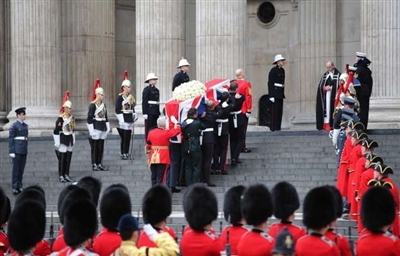 当地时间17日早10时,覆盖着英联邦旗帜的撒切尔夫人灵柩从英国皇家空军的中央教堂、圣克莱门特·达内斯教堂出发,行经英国议会、伦敦市中心,最后到达圣保罗大教堂。一路上,有不少送别撒切尔夫人的民众。