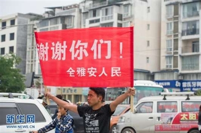 4月22日,灾区青年刘虎高举标语牌感谢参与救援的人们。四川芦山“4·20”7.0级强烈地震发生后,全国各地的救援力量驰援灾区。受灾群众用最朴实的方式表达感激之情。 (据新华网)