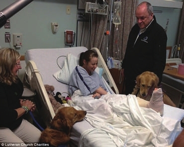 在病房里,这些狗狗温顺的依偎着床上的受伤者。受伤者看到这些狗儿后,倾诉着对爆炸案的恐惧,狗儿成了忠实的聆听者。受伤者表示,狗儿给他们带来了欢乐。