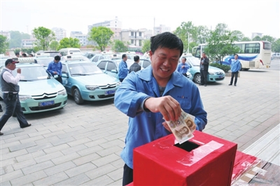 昨日,咸安区新客运汽车站前人头攒动,百余名源通出租车司机自发组织齐聚在此,为雅安地震中的受灾群众捐款。在近半个小时的时间里,百余名司机共捐出7000元的爱心善款。 (毛亚轩/摄)